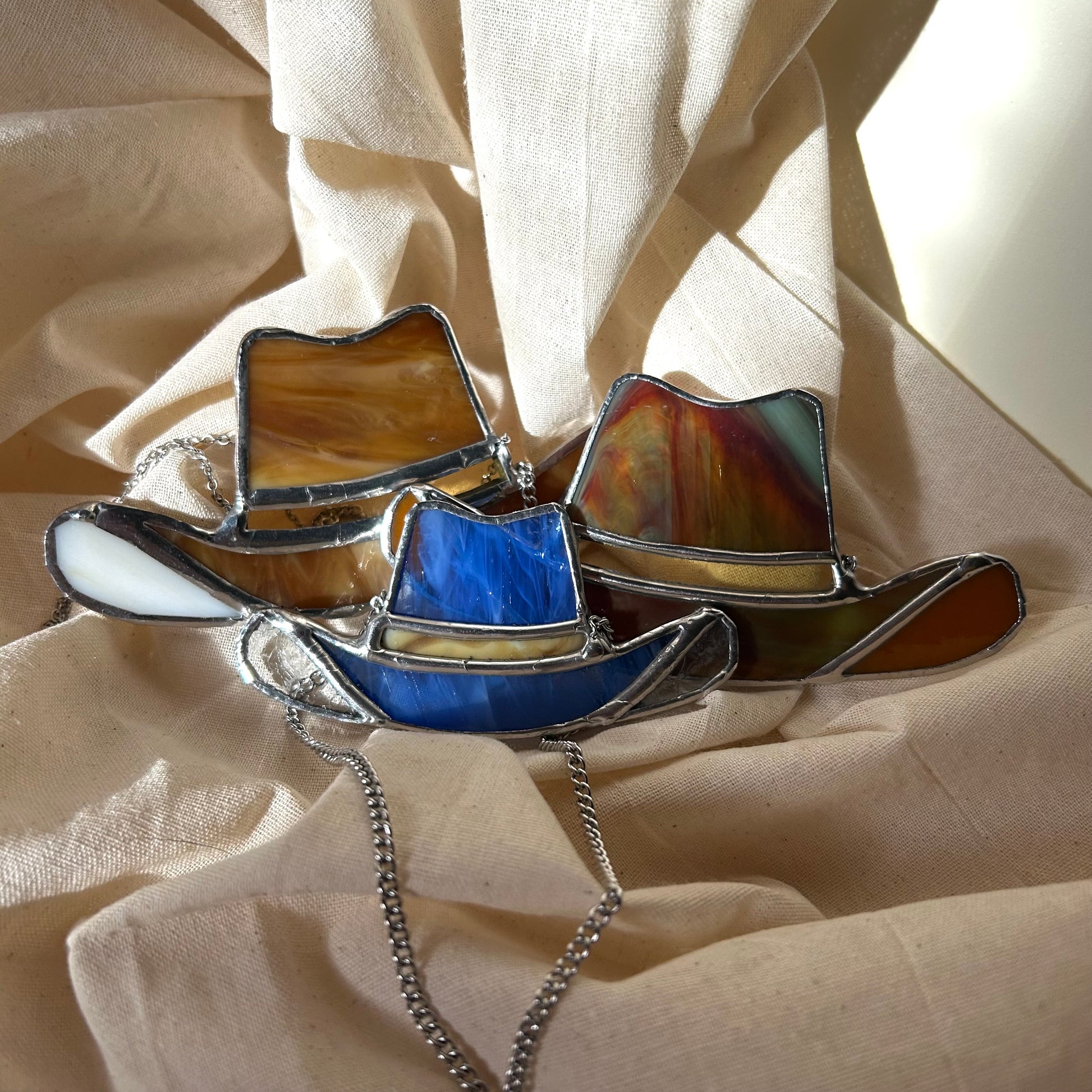 Front facing Cowboy hat stained-glass art that measures 4.74" wide by 2.3"tall for medium.