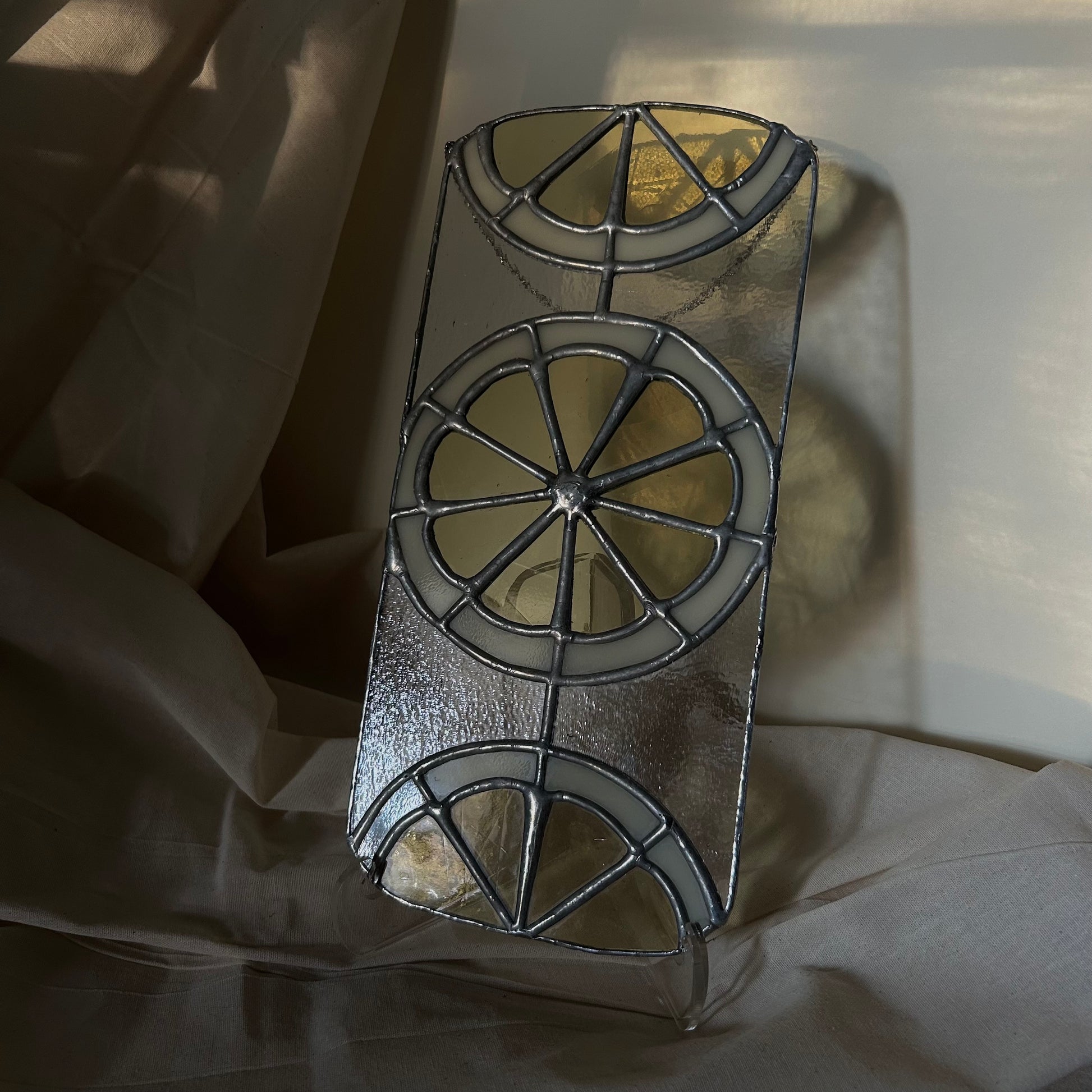 This lemon-themed window panel features a 5" by 10.5" design with three lemon slices, made with silver solder and various shades of glass. The pale-yellow glass represents the rind, while the cracked amber glass creates a juicy and textured effect.