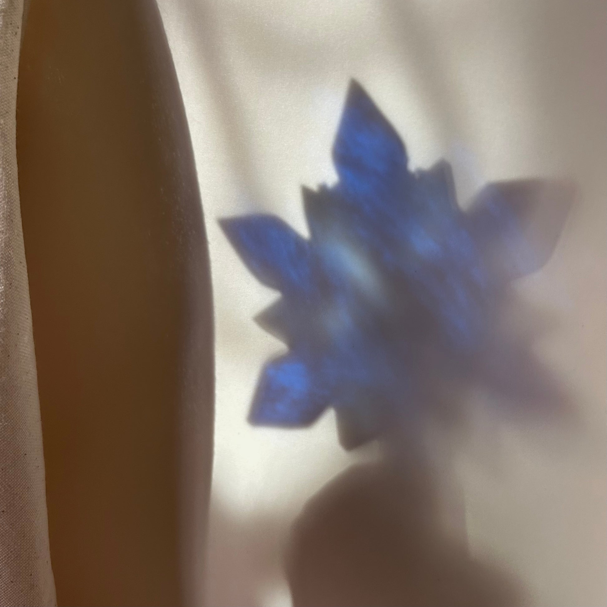 Stained glass snowflake that measures 3.3inches wide by 3.83inches tall.