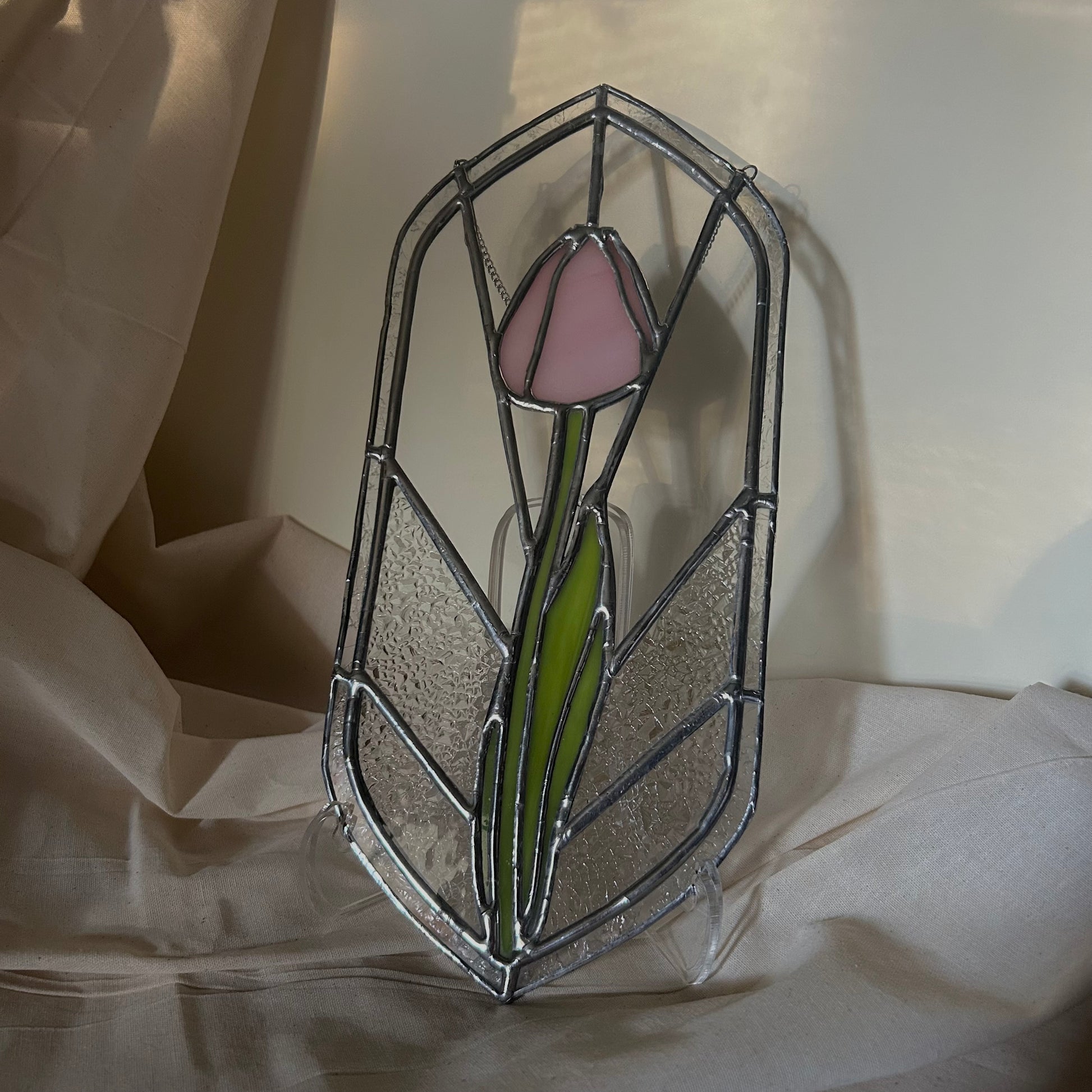 "Spring Tulip" stained glass panel. This approximately 5" by 10" piece features a clear and textured clear background. The petals are a pink and opal mixed glass. The stem and leaves consist of a light green and opal mixed glass. The border is clear glue chip glass.