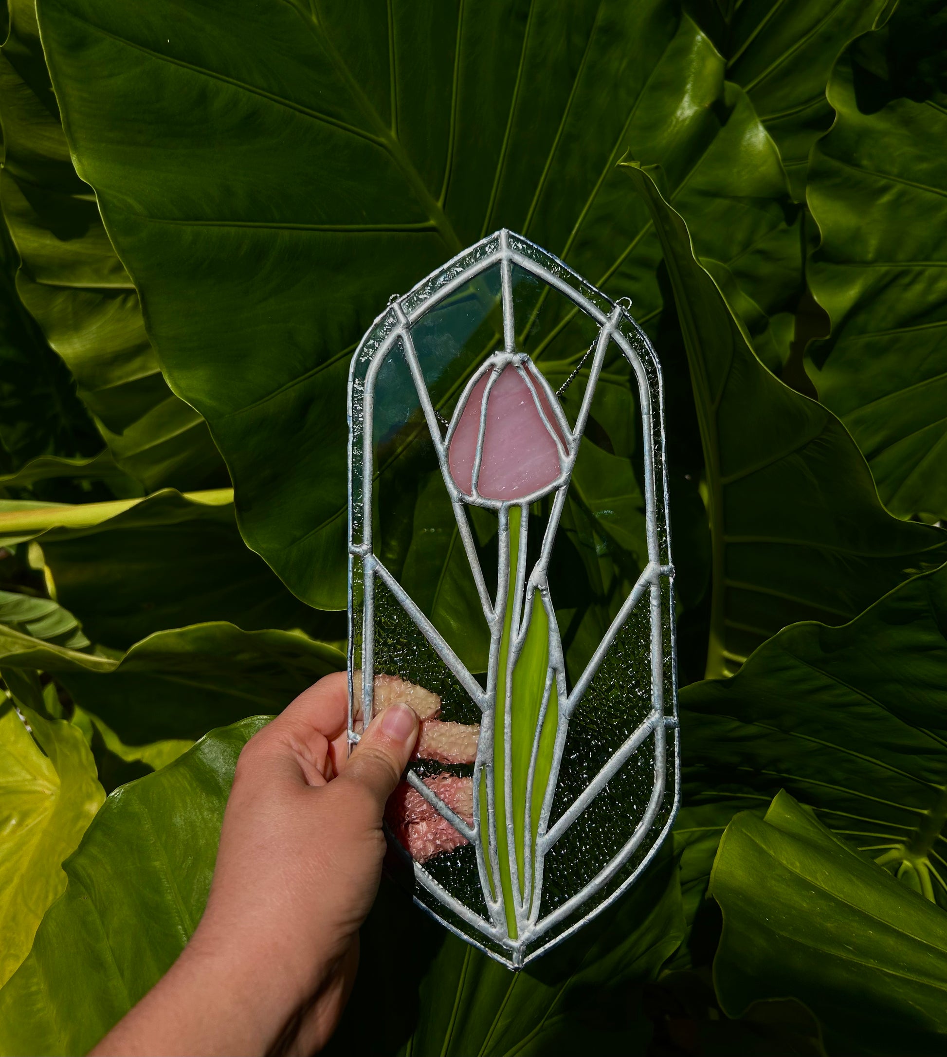 "Spring Tulip" stained glass panel. This approximately 7" x 4" piece features a clear and textured clear background. The petals are a pink and opal mixed glass. The stem and leaves consist of a light green and opal mixed glass. The border is clear glue chip glass. Comes with a chain for easy hanging.