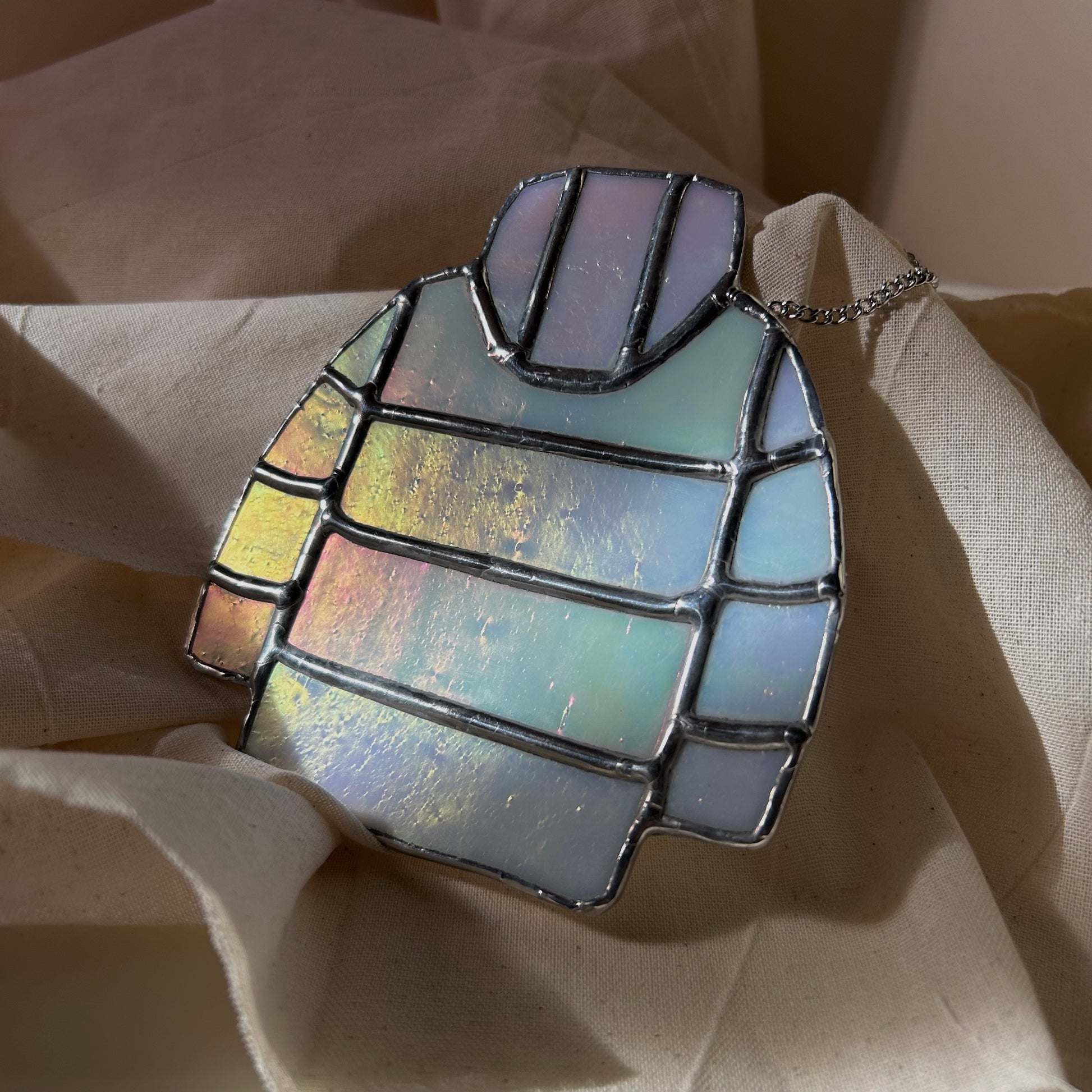 A stained-glass puffy winter coat that measures to be 4.11 inches wide by 4.58 inches tall.
